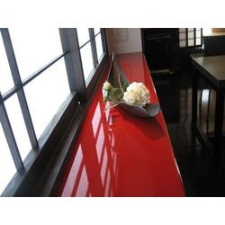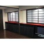 一番こだわったのは、造作カウンターを引き立てる「日本の赤」。この赤に合わせ、全体を黒やこげ茶の色合いに統一し、格子戸や障子戸を組み合わせていきました。