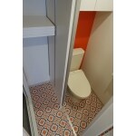 トイレは独立したスペースとして脱衣スペースとの間は引戸で仕切りました。 個性的な柄のクッションフロアと壁紙をお選びいただきました。 元気の出る色です。