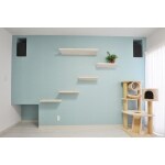 今回の物件は、賃貸マンションの最上階のスケルトンリフォーム。 ご夫婦と小さなお子さんとネコちゃんの3+1の家族構成でした。 ペットを家族の一員として可愛がっていらっしゃるご夫婦の為に換気扇付きのトイレスペースとキャットウォークを造りました。 床材は小さなお子様が少々乱暴に扱っても大丈夫な事と表面のリアルな木目エンボスのノンスリップ 性能の高さから「フロアタイル」(フローリングを塩ビで再現したタイル)をご提案いたしました。 全体のインテリアイメージはオフホワイトを基調にお客様のお好きなペールトーンのブルーをポイント に使い爽やかでフェミニンな空間を目指しました。