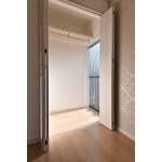 構造上取り払うことが出来なかった壁はプライベート空間を確保するために活用することを提案。 空間をすっきり保つために大容量のクローゼットを提案。クローゼット内部は、収納するものによって整理整頓ができるよう可動式の棚板などの設置を提案。