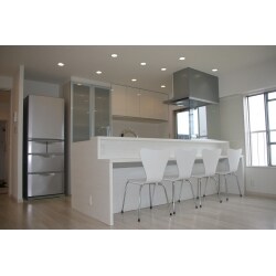 キッチンの間仕切り壁を撤去し、対面型に変更しました。家族団欒を楽しめるキッチン空間です。リビング床には床暖房を設置し、隣との壁は開閉間仕切りとして広く使える空間にしました。