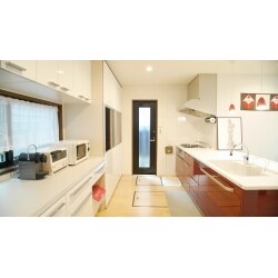 キッチン本体では、扉が美しいトクラスのベリー(シャインカラー)をご提案いたしました。 収納ではかなりはっきりとしたイメージをお持ちだったので、LIXILの2WAYクローゼットをご提案、残りの収納部は扉の大きさを統一させるため、600ピッチの収納を設置しました。