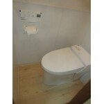 腰下サニタリーパネル、クロス、クッションフロアーの内装工事。 節水タンクレス便器の取替で、明るく、広く快適なトイレへ、リフォーム