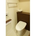 収納力を確保したいとのことで、私共は、タンクが実は隠れていて両脇には収納ができる「キャビネット付きのトイレ」をご提案。合わせて、トイレの上部に吊戸棚もご提案いたしました。キャビネットと吊戸棚の間の奥の1面はアクセントクロスにして、狭い空間ながらも引き締まったおしゃれな空間へとなるようご提案し、採用して頂きました。