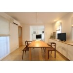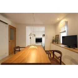 ダイニングには、壁面にローボードを設置。床から少し浮かせることによって、あしをいれられ使い勝手がよい。収納が豊富にあることによって、テーブルがいつもきれいな状態にたもてる。電話やプリンターは、オープン収納としている。TVやインターネットなどのモデム機器も収納のなかにおさめている。