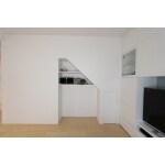 リビングには、壁面収納を新設し収納力をあげている。階段したの斜め部分は、ペットコーナーとして計画している。
