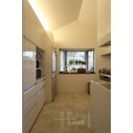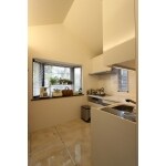 天井を勾配天井として、上部への広がりをだしている。カップボードの上部には、間接照明を設置しキッチンの照明器具としている。天井に余計な照明がない分、勾配天井の三角がきれいにみえる。