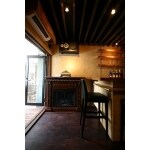 古材のカウンターが美しい。壁は、塗り壁仕上げとなっている。電気式の暖炉もおかれている。落ち着いた色合いの大人の空間。