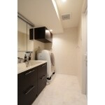 洗面室の間取りを拡張し、広々とした洗面室へ。洗濯機も洗面室に置けるようになり、使い勝手も向上しました。