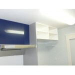 冷蔵庫置き場はキッチンコンロ脇に移設しました。間仕切り部分は安全を考慮し耐火の間仕切り板を使用。対面キッチンで吊り戸がなくなるので少しでも収納の確保ができるように冷蔵庫上に収納を設けました。換気扇も清掃性の優れた自動洗いも出来る洗エールレンジフードを採用しました。