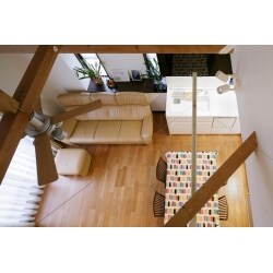 (旧東京ガスリモデリング株式会社での事例です。)天井を撤去した際に現れた梁や既存の柱を活かし、木目の味わいをデザインに取り込みました。リビング上部には天井高を活かして屋根裏部屋を新設しました。