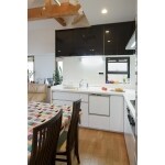 (旧東京ガスリモデリング株式会社での事例です。)LDKの広さを確保するため、キッチンは対面式ではなく壁付けのL型に。キッチンやカップボードは下部は白で、上部吊戸棚は黒でまとめています。
