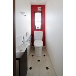 (旧東京ガスリモデリング株式会社での事例です。)トイレの一面に採り入れた赤のクロスが、スタイリッシュな空間によく馴染みます。