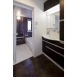 (旧東京ガスリモデリング株式会社での事例です。)スタイリッシュな洗面室。浴室暖房乾燥機は、洗面室まで暖まるので入浴がぐんと快適に。