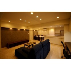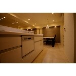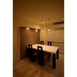 リビングと和室をつなげて、広いLDKへ間取り変更しました。 リビングとダイニングの側面にはグレーのエコカラットを施し、モダンな空間作りと、機能面の双方を存分に生かしています。 また凹凸のあるデザインは、ライティングの効果も一興。 陰影を引き立てるダウンライトは。目立たないブラックを選び、その設置面も黒のクロスを配して視線の配慮をしています。