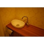トイレとは思えないラグジュアリーな空間。 全体を引き締める木目の造作カウンターに、丸みを帯びたフォルムが可愛らしいセラトレーディングの手洗器。 壁面の一面には光沢のあるモザイクタイルを施し、他三面はジャボン玉のような柄クロスを組み合わせ、小スペースながら、贅沢な空間ができました。
