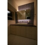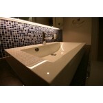 背面にINAXのモザイクタイルを一面に配し、まるでホテルのようなパウダールームができました。 存在感のある洗面器はカクダイの商品を採用。 広いスペースに洗面器も大きく、ご使用が重なってもゆったりとご利用できます。