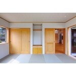 和洋折衷なモダンな和室。縁なし半畳タタミを市松模様に敷き詰めました。また建具はフローリングを同じ無垢のパイン材。温かみのある和室が完成しました。