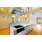ダイニングに対面する形で設置したアイランド型キッチン。家族とコミュニケーションをとりながら楽しく料理ができるレイアウトです。