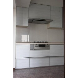 システムキッチンはお施主様がショールームへ足を運んで決定されたクリナップ「ラクエラ」に。お手入れ性を重視し、ステンレス製のフィルターでお手入れがしやすい「とってもクリンフード」や人工大理石のカウンターを採用。クロスとクッションフロアも貼替ました。