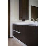 幅が180㎝近くある洗面化粧台は下台部分を交換。1mm単位のサイズオーダーとカウンターや洗面ボウル、キャビネットの組み合わせが自在なTOTO「システム・Jシリーズ」を採用。空間にぴったりと納まるようオーダーした下台を取付けました。