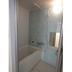 リフォーム後のユニットバス:水廻りを分離。ユニットバスは爽やかな水色のアクセントパネルを採用しました。