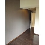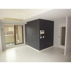 リビングに入って右手の壁は黒色のアクセントクロスを施工。フローリングはPanasonicのウッディAシグノです。 白色のフローリングと黒色のクロスでメリハリのあるオシャレなリビングとなりました。