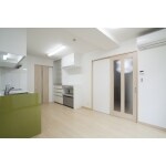 家具をおいて収納をするのではなく、クローゼットなどを設けてそこに収納するように壁面一面に大容量の収納を設けました。 ダイニングキッチンと居室と両方からアクセスできるような間取りになっています。