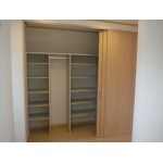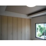 ご高齢のお父様の寝室へ間取り変更をご提案させて頂きました! 間口3.3m、高さは天井までの大容量クローゼットを新設。 既存の折り上げ天井は生かし、色調を変えた天井クロスや木目フレームの照明器具で、優しく落ち着きのある空間に仕上げてあります。