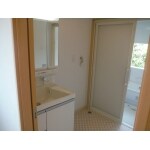 「脱衣スペースを兼ねた洗面室は、0.5坪(畳1枚)の広さ・・・。 洗濯機は少し離れた土間の部分にあるので、使い勝手の良いところに置きたい。」