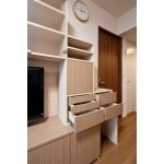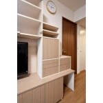 リビングダイニングの家具のレイアウトを変えすっきりとさせるため、食器棚とテレビボードを一体化したいという要望をいただきました。リビングと洋室にそれぞれ、ペット用のスペースを入れ込んだ造作家具を取り付けることにしました。