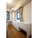 主寝室のベッドの横にデスク兼本棚の収納を造作致しました。面材はシンプルなホワイトでまとめています。デスクカウンターのサイドには本や書類をすぐに取り出せるオープン部と開き扉内にすっきりと収納できる棚を天井まで設けています。手前のオープン部はペット用のトイレを置けて、上部の開き扉部には砂などペッ用品を収納することができます。