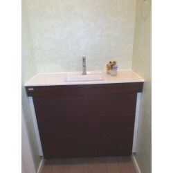 陶器のボウルを深いものにし、収納スペースが大きいキャビネットに変更しました。今回は、便器の対面位置にある手洗器の交換ですが、最近リフォーム現場で、便器のタンク上ではなく、トイレ内の収納スペースやカウンターに、手洗器を作るのが流行っています。トイレは部屋が小さいので便器の交換ぐらいしかできないとお考えでしたら、ご相談下さい。 価格にクロス張替工事は価格に含まれていません。