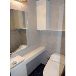 タンクレス風のすっきりしたデザインのトイレへ交換し、手洗カウンターも奥行きの浅いスリムなタイプを採用。また、これまで収納場所の無かったトイレ廻り用品を仕舞えるよう壁に収納棚も取付ました。