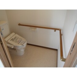 将来、車いすが必要となった時のことも考慮し、車イスにも対応出来る広々とゆとりのあるトイレプランとしました。 バリアフリーな引き戸になり、身体能力に合わせた使い勝手の良い手摺を設置。 御祖父様お一人でも、安心してトイレに行くことができます!
