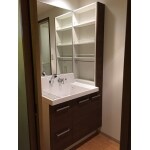 浴室のアクセント壁パネルと洗面化粧台の扉の色を合わせました。 また現状の埋め込み収納を、サイドキャビネットに変更したので、お客様の洗面まわりでのコンセントの利用方法が変わらないように、キャビネットの加工をさせていただきました。