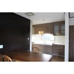 キッチンが孤立されていない空間の為、ダイニング空間のイメージに合うように、木目のキッチンをご提案しました。I型キッチンの隣にカップボードを設置することで、動線を楽にしました。