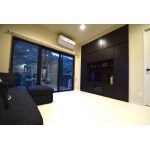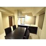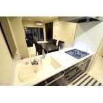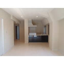 キッチンはリビングまで見渡せるフラット対面式です。キッチンの前壁をなくし開放的になりました。大きいカウンターで料理スペースを広くとれます。LDKは白と黒を基調としてスタイリッシュにまとめました。