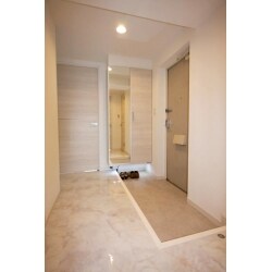 ご購入された中古物件を”生活スタイルに合ったものにしたい”とお話を頂き、古い設備の交換と収納を充実させることを中心にリフォームしました。水廻りは、キッチンをより広くしたいとのご希望から、隣接する洋室のクローゼットとの間仕切りを移動して、空間を広げました。さらに、出入り口上部に通るダクト用の梁を空間に出さずにすっきりさせたい、とのことから、キッチンの向きを反転させて洋室クローゼット側へ移設、ダクト経路となる梁をクローゼット内部へ納め、キッチン空間をすっきりさせました。また、収納スペースを充実させる為、各室の収納も改修。収納の無かったリビング・ダイニングは出入り口の横に新たに収納を造作し、可動棚を取付。洋室2.は、間仕切りを移動して、既存のクローゼットを拡張、ウォークインクローゼットに。玄関はミラー付きのトールタイプの玄関収納を設置して、収納容量を増やしました。収納下には間接照明を。大理石調の塩ビタイルで仕上げた床に光を反射し、玄関・ホールの空間全体がより明るい印象に。内装だけでなく、各居室や洗面室、トイレ等のドアもホワイトの木目調のものへ交換し、白を基調とした明るい空間に仕上がりました。