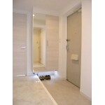 玄関はミラー付きのトールタイプの玄関収納を設置して、収納容量を増やしました。収納下には間接照明を。玄関とホールはそれぞれ、塩ビタイルで仕上げました。ホールは大理石調のものを、玄関は滑りにくい石目調のものを採用。床に光が反射し、空間全体がより明るい印象になりました。