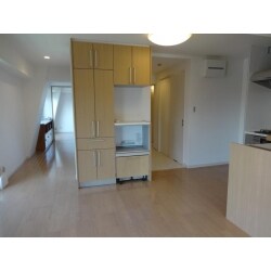 キッチンは壁付けのI型プランからL型プランへ変更し、冷蔵庫スペースを確保。 LDK空間全体で床上げを行い、フローリングで仕上げ、クロスも貼替えました。