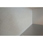 ベッドヘッドは、幾何学模様のアクセントクロスの中心にイタリア漆喰「ポルべーレメディア下地ベネチアーノ仕上げ」を採用し通常の「ポルべーレメディア」より華やかに仕上げました。