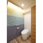 洗面との間仕切りを取り払い一室としたので、広々としたトイレ空間を実現しました。ダウンライトと調光可能なライン照明をつけ用途により使い分けができるようにしています。