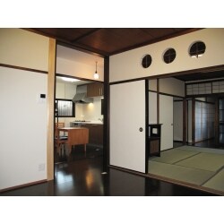 レトロな雰囲気を感じる木製ガラス窓や優しい飴色に焼けた柱、板張り天井などを残し、深い色合いのフローリング材を用いたことで印象的なリビングが完成しました。 リビングとDKの位置は変更せず、開口部を変え(①引違戸→オープン ②引違戸→2枚引き込み戸)、必要なときには開け放せる、使い勝手のよい快適なリビング、DK空間に。 壁は下部をクロス貼りに、木部で区切られた上部は珪藻土調塗り壁とすることで、機能性と意匠性の両方に配慮しました。