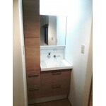2階の洗面スペースを一新。収納もたっぷりで落ち着きのある木製キャビネットのデザインを提案しました。