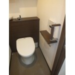 お客様のご要望もあり、トイレはタンクレスにしました。 また便器の後ろに洗面ボウルを、扉付近には手すりを設置しています。