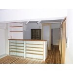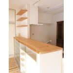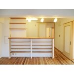 写真や小物などが飾れるようにカウンター横や下部を造作いたしました。床は杉板、壁は珪藻土塗りで仕上げました。