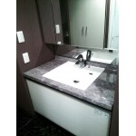 洗面室。大理石調の床と洗面カウンターが贅沢な空間を生み出します。