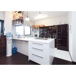 店舗だったスペースはLDKと主寝室へと改装しました。広さだけでなく高さにもゆとりのある開放的な空間になっています。床材は大建工業のエクオスロッゾ。アッシュダークの色味が空間に落ち着きを与えてくれます。 間口2.5mの掃き出し窓からは暖かい陽の光が降り注ぎます。キッチン・ダイニングスペースの照明のペンダントは、ご主人様自慢のコレクションの一部、骨董のガラスシェードを使用しました。