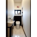 トイレはスッキリとした見た目の美しさとお手入れのしやすさを気に入られて、TOTOのレストパルを設置しました。大理石調の床材がシンプルな空間の中で高級感を演出します。